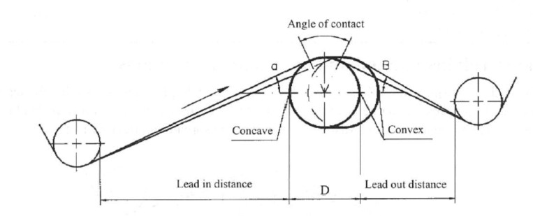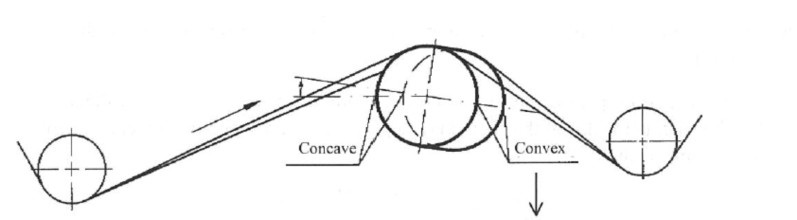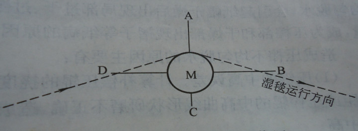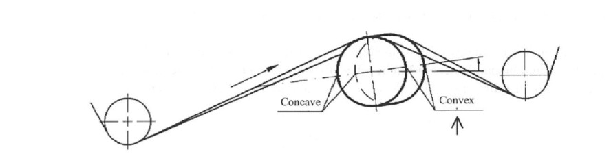 When the curved plane is at position B, the roll has the maximum spreading effect on the felt or web. If rotated from B to A or C, the spreading effect gradually decreases, reaching zero at points A and C. If the curved plane rotates to point D, the felt or web will experience the maximum narrowing toward the center. Thus, simply changing the position of the arc roll can adjust the transverse spreading effect.